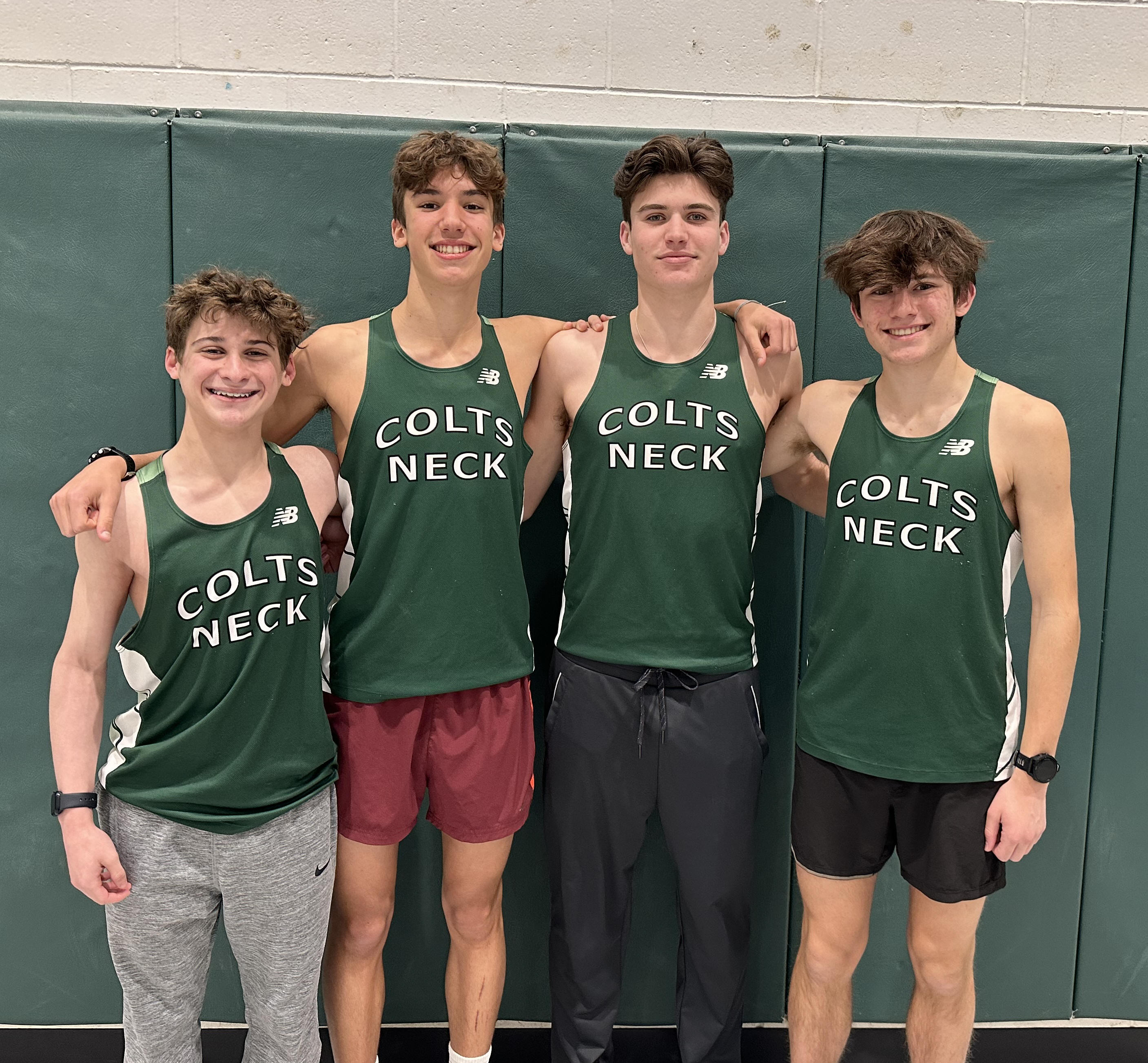 | L-R Jay Adimala, John Shapiro, Coach Schlentz, Andrew Krok, Jacob McNamara | Andrew Krok anchors 4 x 800 victory. |